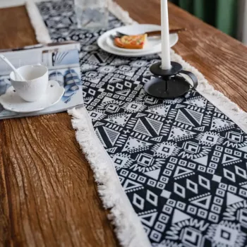 Black and White Geometric Jacquard Table Runner with Tassels - Elegant Home Decor